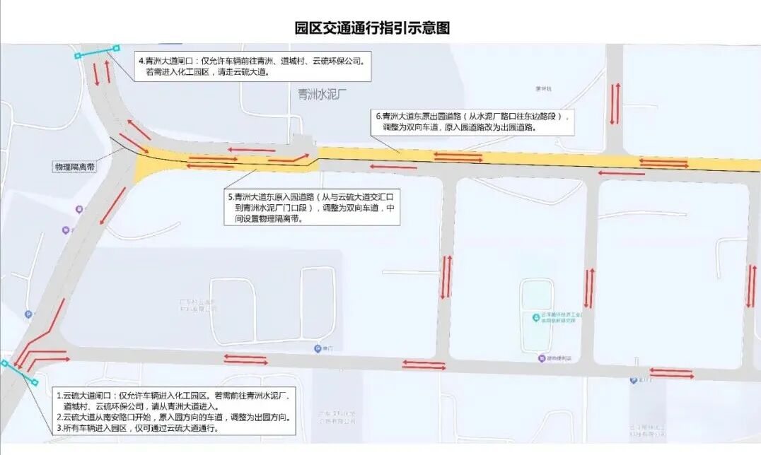 3.保留云硫大道闸口,云硫大道北原入园方向改为出园方向,园区业务车辆、人员由云硫大道入园后,沿云硫大道(入园)→南安路→创新路(云海路、信安路)→青洲大道东→云硫大道(出园)。