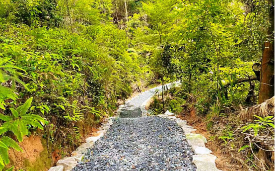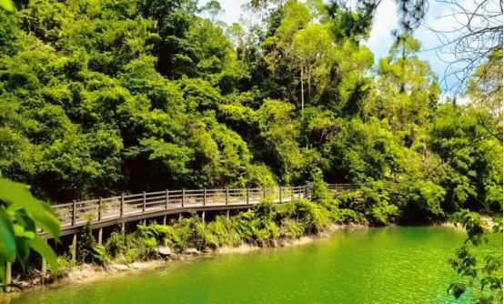 步道设计上充分保护和维护原始自然景观、植被和野生动植物栖息地,采用节能环保材料,最大限度减少对自然环境的破坏。沿途不仅保留原有的植被群落,且就地取材,用木屑木材等材料制作休憩设施和互动装置。结合森林质量优化提升工程,在步道两侧、岔路、转弯口和休息点等区域,种植枫树、木棉、凤凰木等景观效果良好的乡土阔叶树种;在湖边步道开展堤岸防护林建设,种植固土效果良好的阔叶树种,有效提升区域生物多样性和生态涵养功能。