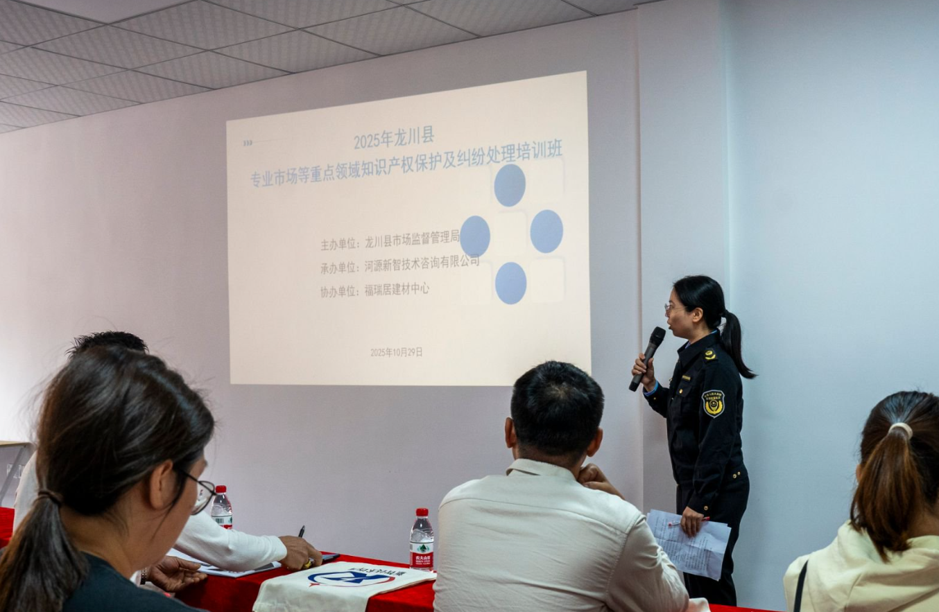 10月29日,由龙川县市场监督管理局主办,河源新智技术咨询有限公司承办,福瑞居建材中心协办的专业市场等重点领域知识产权保护及纠纷处理培训班成功举办。龙川县福瑞居建材中心等专业市场入驻商户、相关行业组织及服务机构代表等共30余人参加了此次培训。