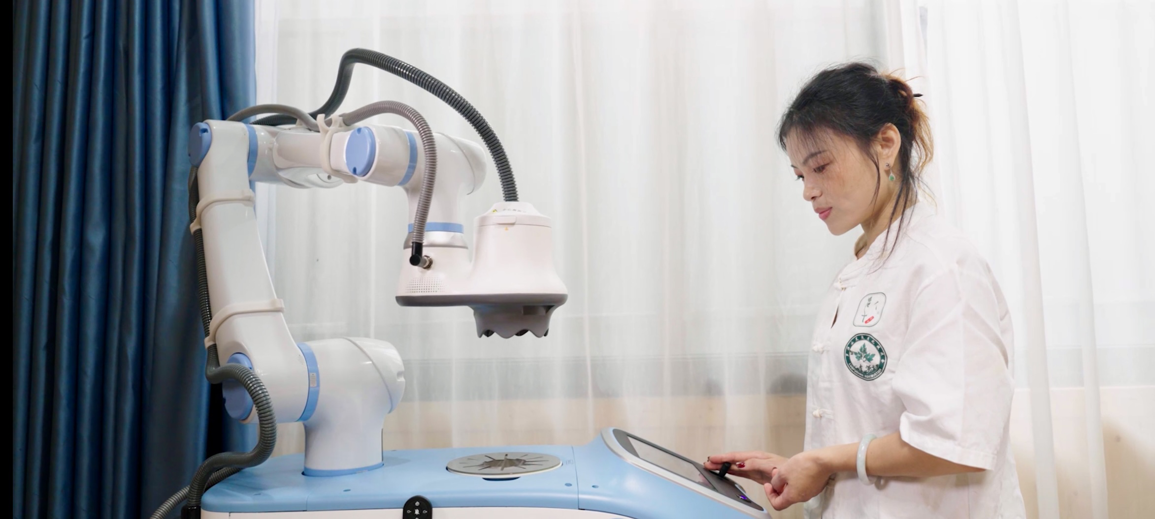 走进艾灸机器人展厅,古朴雅致的木质建筑与科技感十足的智能设备相映成趣,呈现出传统与现代交融的独特氛围。曹洪娟重点介绍了园区的核心创新成果——艾灸机器人。据了解,该机器人能够替代传统人工艾灸,精准定位穴位,并支持五大补法灸法选择。相比人工操作,艾灸机器人更安全、更精准,还能自动抖灰并持续施灸,让康养体验更加持久高效。这款深度融合人工智能技术与中医艾灸理论的设备,成为园区以科技赋能传统艾产业的生动例证。