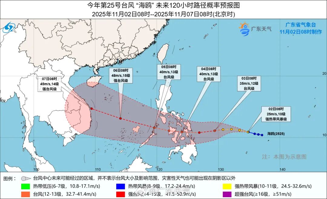 今年第25号台风“海鸥”(英文名:Kalmaegi,名字来源:朝鲜;意义:一种海鸟)已于1日20时在菲律宾以东洋面生成。今天(2日)08时加强为强热带风暴级,其中心位于距离江门市沿海东南方向约2640公里的海面上,也就是北纬10.9度、东经134.8度,中心附近最大风力10级(25米/秒),中心最低气压985百帕。预计,“海鸥”将以每小时25公里左右的速度向偏西方向移动,4日穿过菲律宾中部,5日移入南海东部海面上,强度逐渐加强,最强可达台风级或强台风,逐渐趋向越南中南部沿海。