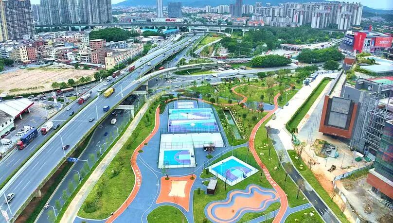 花都城际公园位于花都大道莲山路至海布立交路段,是花都区以“人民城市”理念打造的开放式公园先行板块,通过系统性改造提升花都大道新白广城际铁路上盖公共绿地、将原本单一的交通绿带转变为集休闲、运动、文化于一体的开放式全民共享公园。