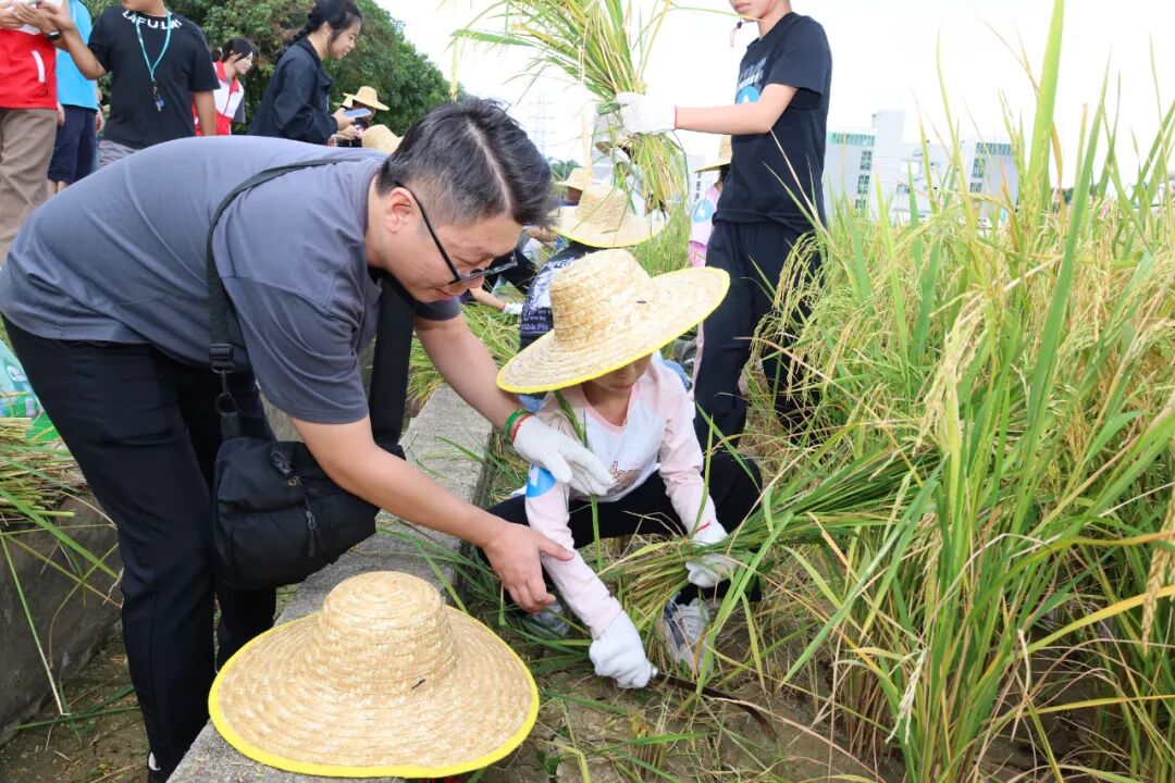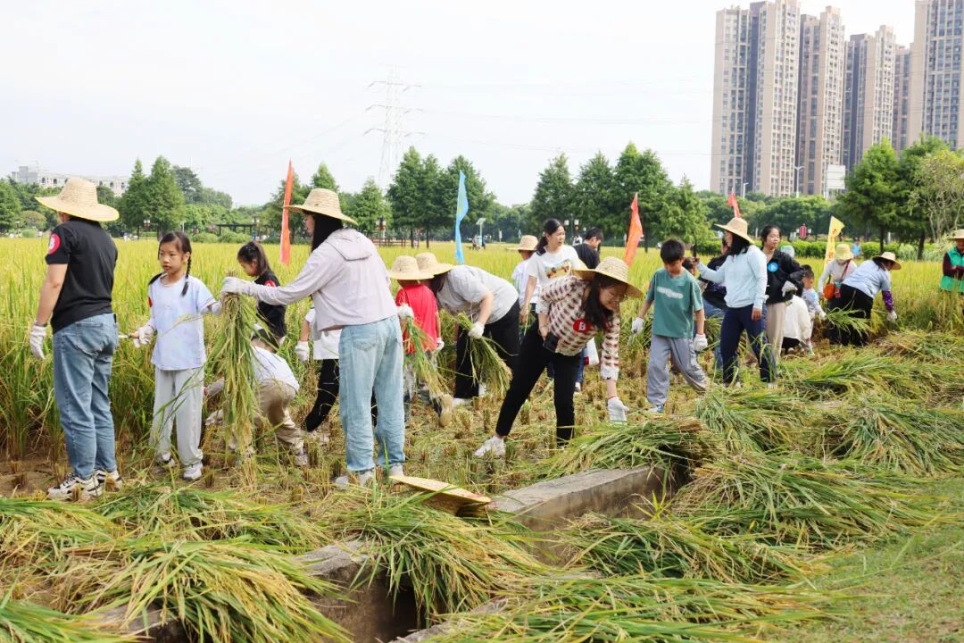 农耕研学体验将活动推向高潮。经过简单的热身运动后,26组家庭迅速投入热火朝天的收割体验中。孩子们在农技老师和家长的指导下,小心翼翼地握住稻秆,学着挥舞镰刀收割水稻,虽然动作略显生疏,但在一声声鼓励声中,大家坚持完成了任务,每一束收获都凝结着汗水。