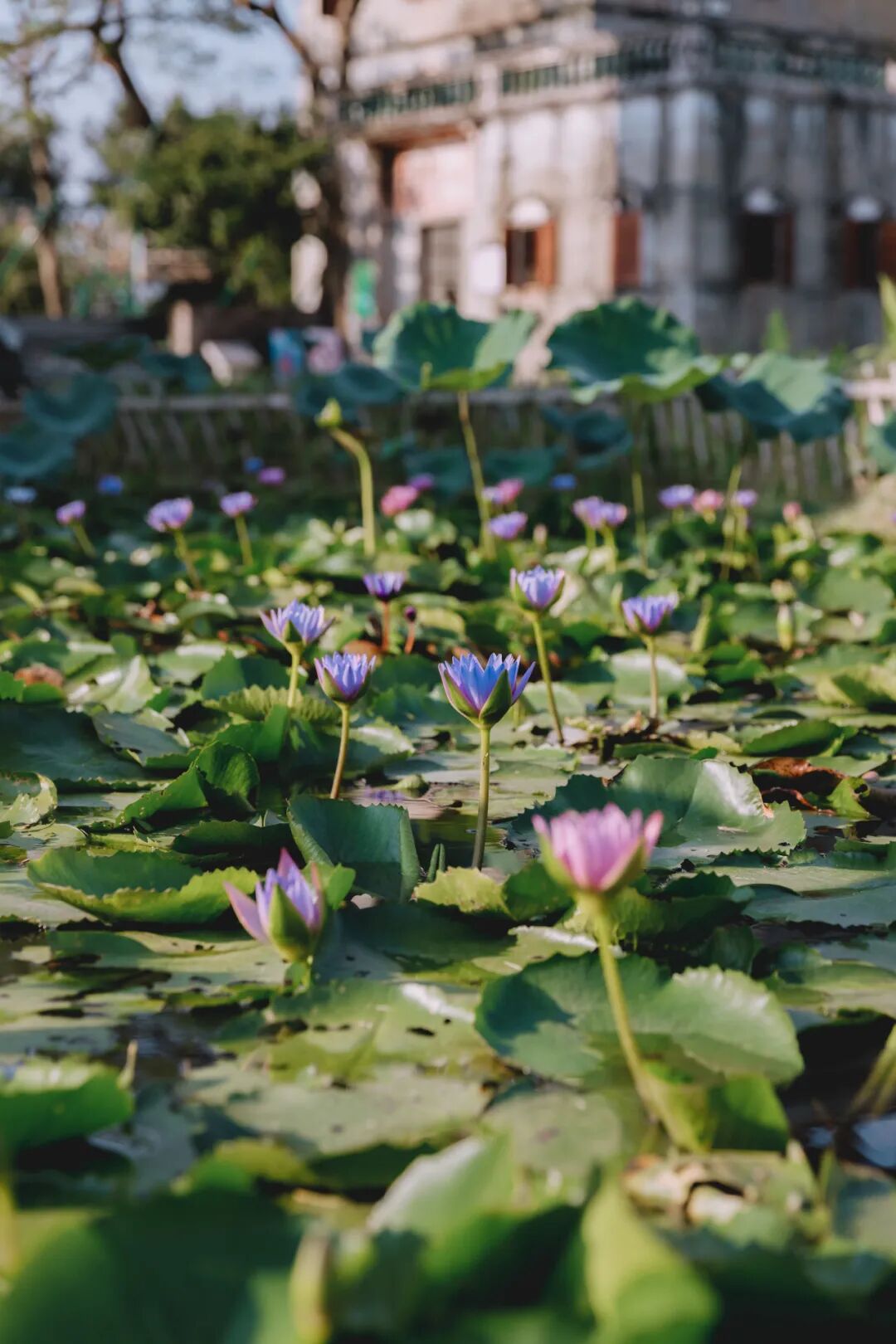 池面倒映碉楼与云影,睡莲在其间静谧绽放,勾勒出一幅充满惬意的画卷。若运气好,还能偶遇采蜜的蜜蜂。