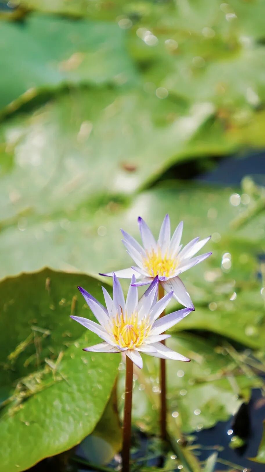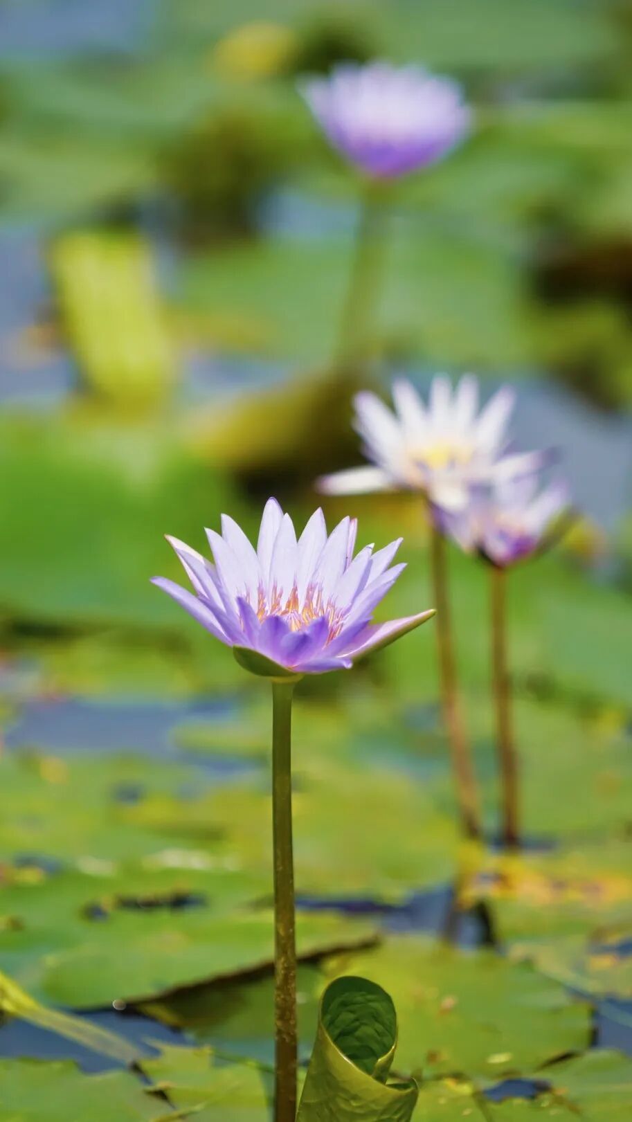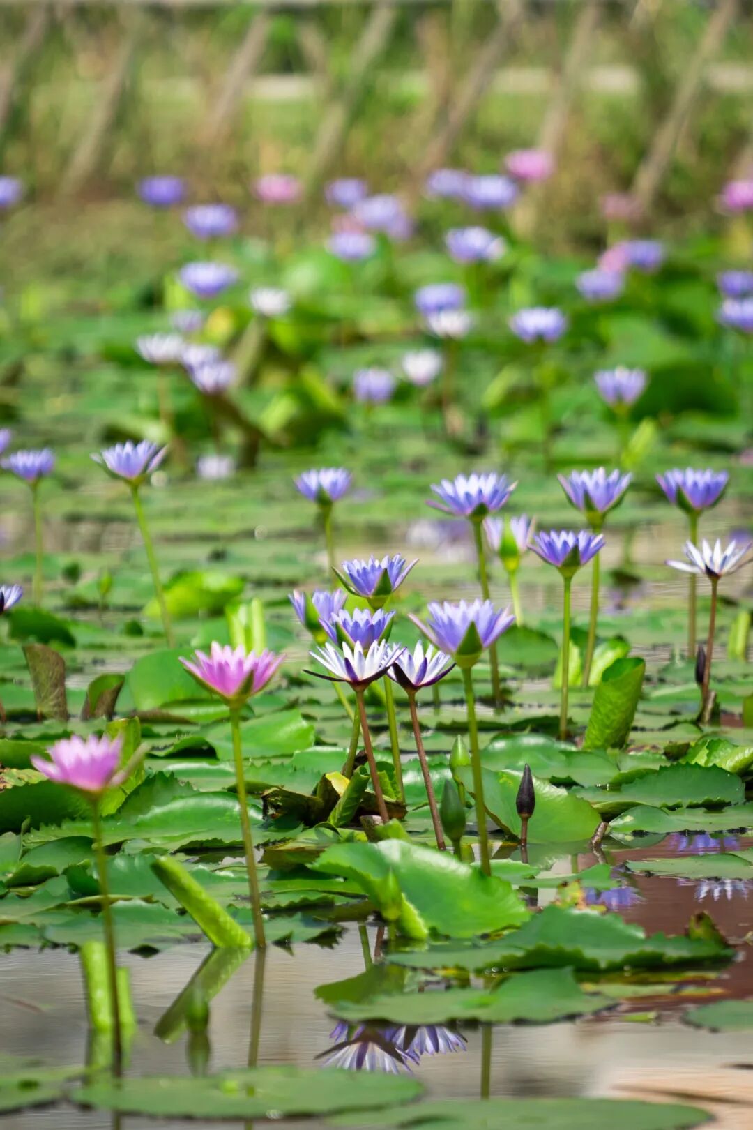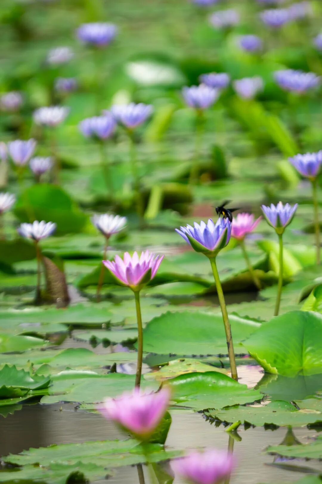 不同于稻田的灿烂张扬,睡莲的美含蓄而慵懒。圆润叶片如翡翠托盘,托起或粉或紫的花朵,静静漂浮于碧水之上。