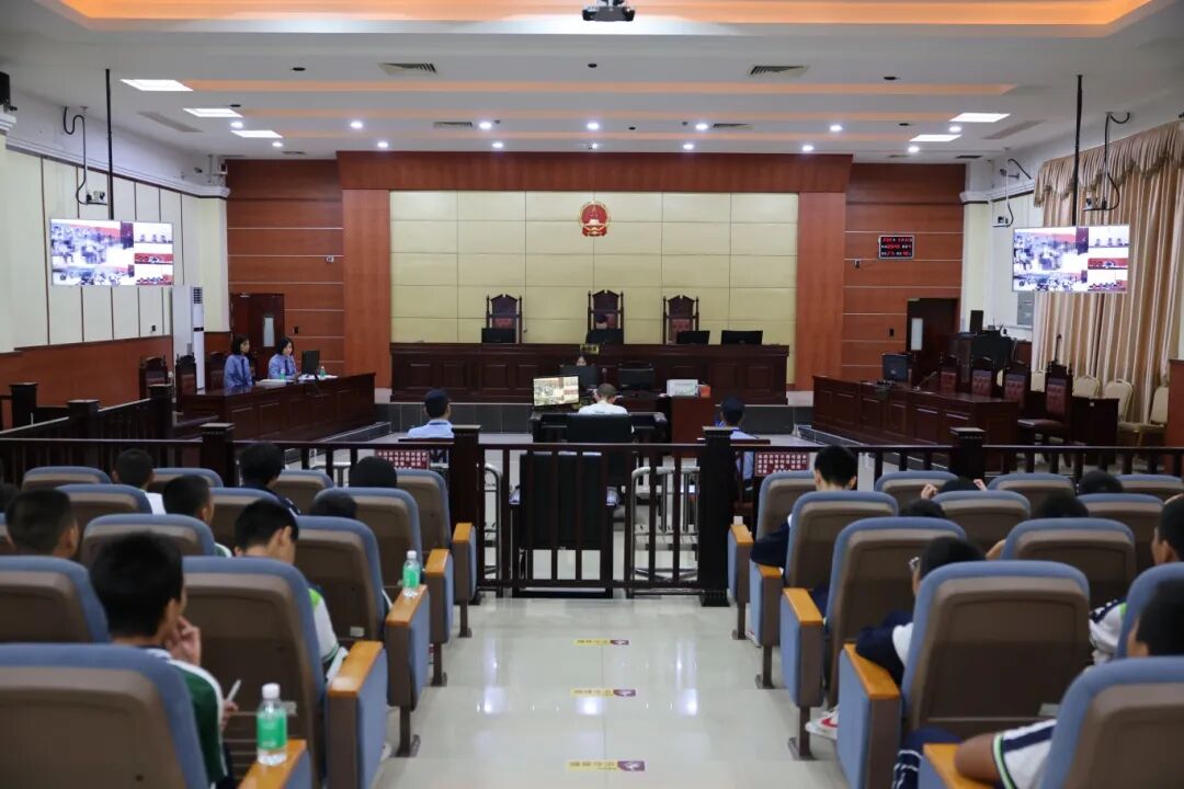 活动首站,同学们走进庄严肃穆的审判法庭,旁听一起贴近校园生活的真实案件的庭审,感受法律公正严明,从内心里敬畏法律,带头拒触法律底线。