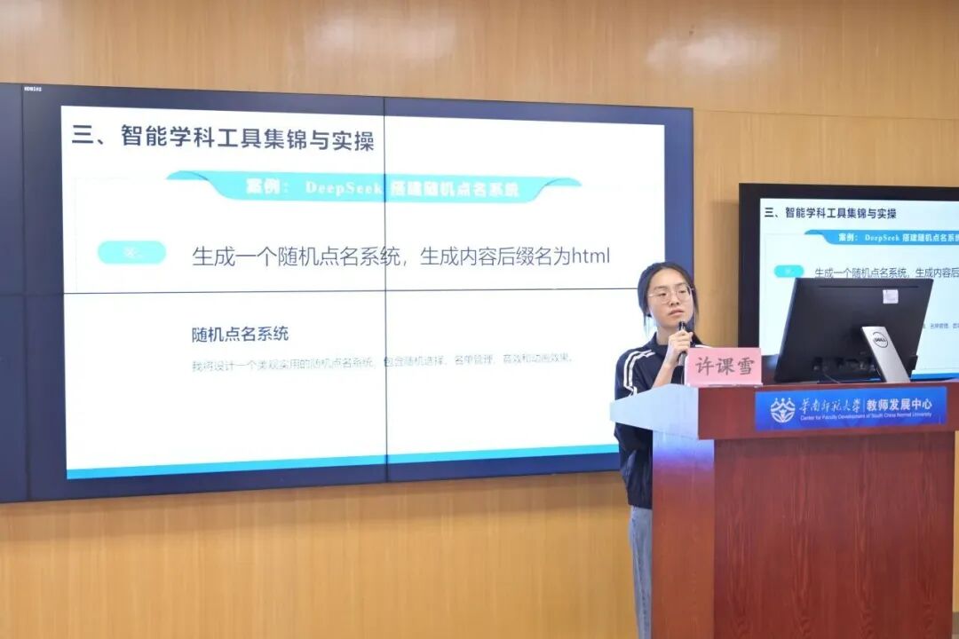 本次研修班以国家教育数字化战略为指引,聚焦人工智能与教育教学深度融合,研修内容兼具理论深度与实践价值。华南师范大学教师发展中心、教育人工智能研究院胡小勇教授等老师深入解析人工智能教育应用前沿趋势,展示了人工智能在教育教学中的创新应用场景,系统讲解了生成式人工智能在实践工作中的应用技巧,还围绕教学评价创新、人机协同教学设计、科研新范式等主题展开分享。