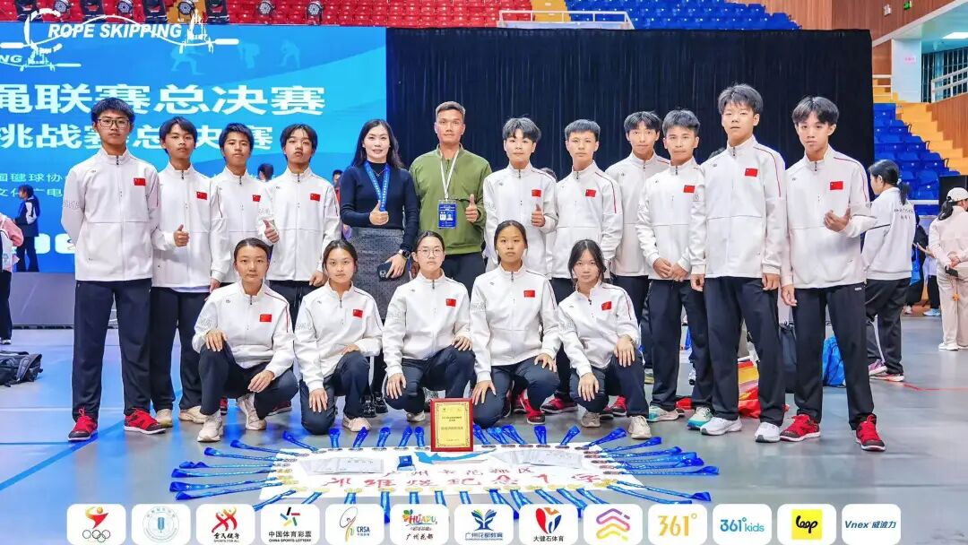 从校级比赛到国际赛场,钟炜锋的脚步从未停歇。8岁斩获首个洲际冠军,10岁在挪威跳绳世界杯上夺得7金2银,多次在全国跳绳联赛总决赛包揽冠亚军。2025年更是他的“荣耀之年”:7月在广东省第十四届中学生运动会上,与队友合力夺得男子4×30秒单摇接力冠军,跳出864次的优异成绩;随后征战世界跳绳锦标赛,在16+男子组4×30秒单摇接力项目中,先后以854次、856次两次刷新世界纪录,最终夺得银牌。