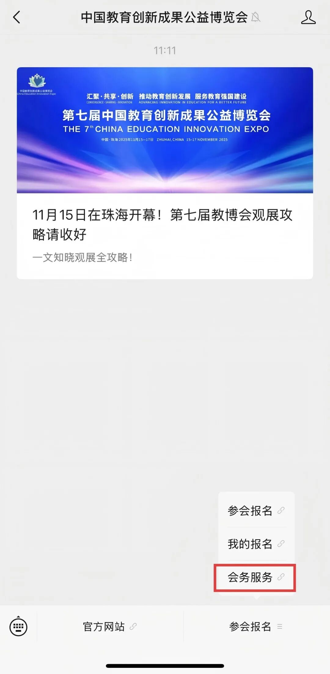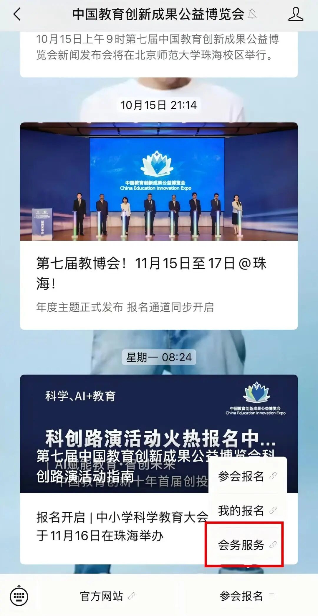 本届教博会在线参会报名通道已在教博会官方服务号开启。报名方式:关注“中国教育创新成果公益博览会”微信服务号,在主页“参会报名”栏目进行报名。
