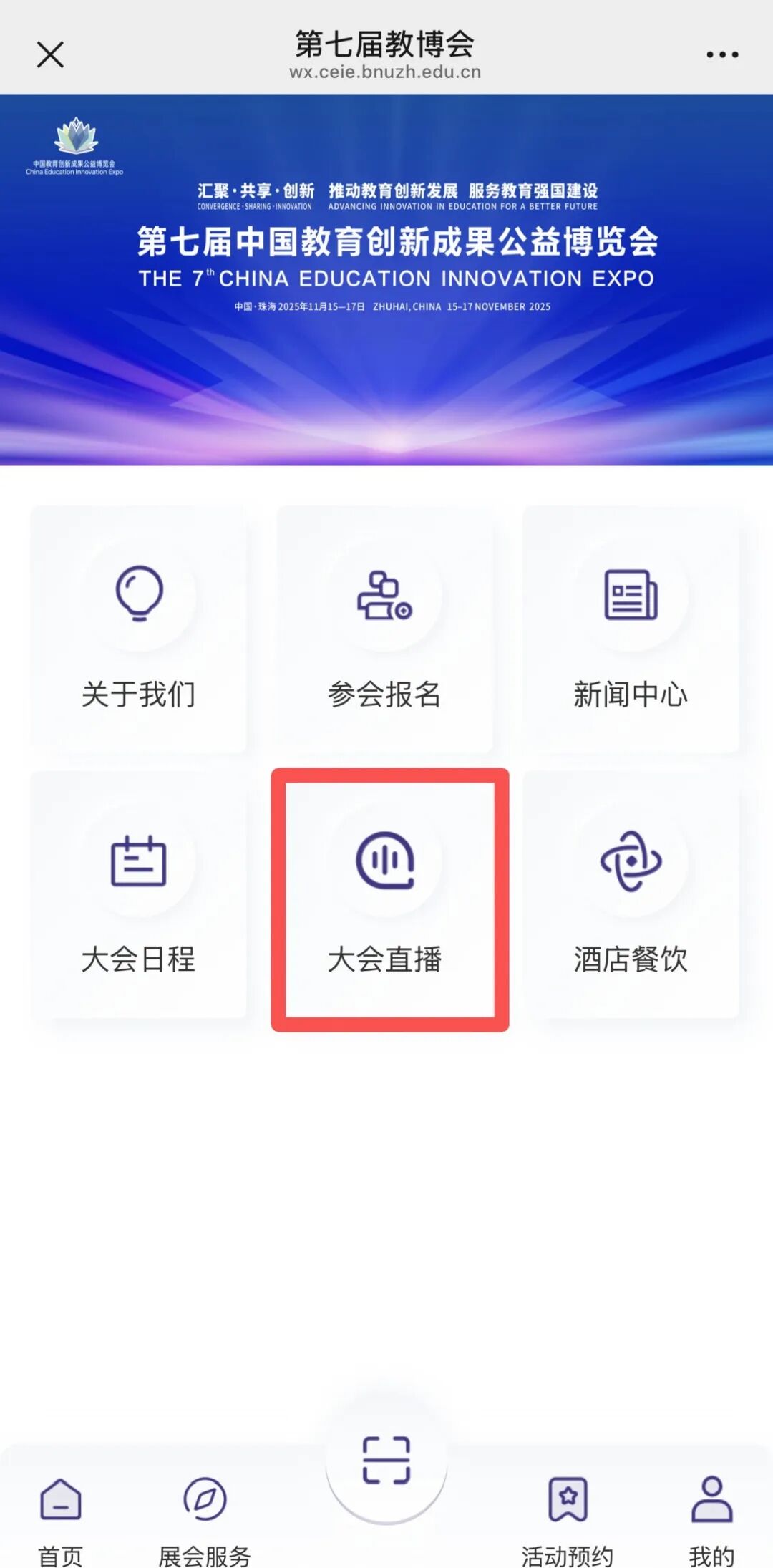会期内可在“中国教育创新成果公益博览会”服务号点击“会务服务—大会直播”栏目中观看、分享。
