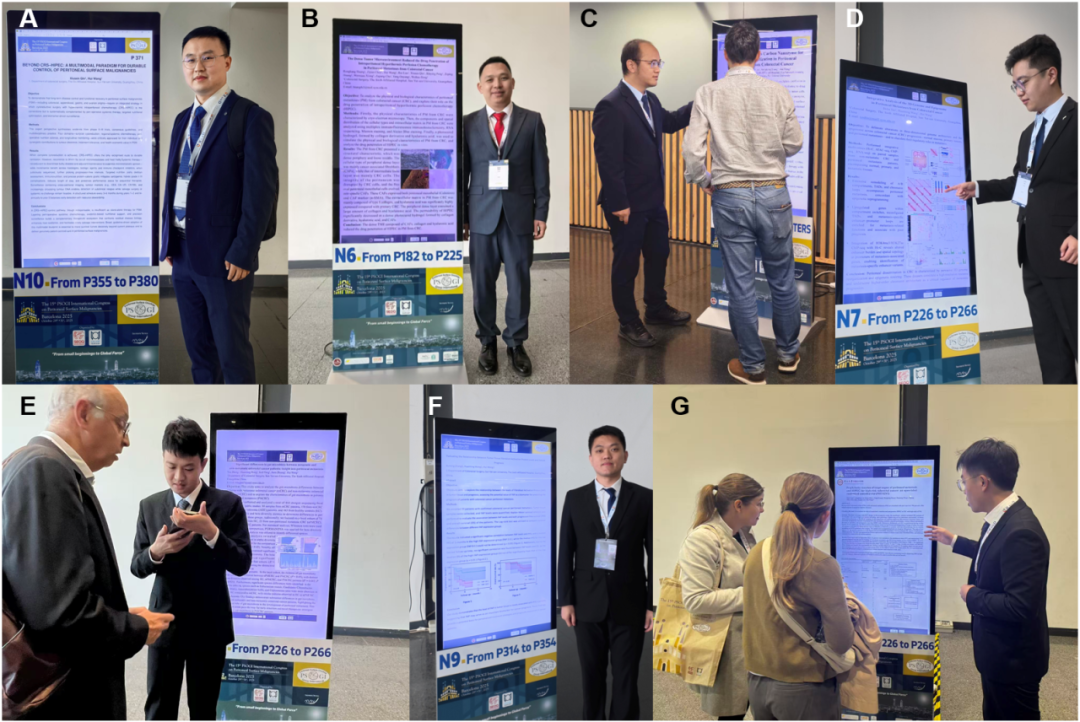(A-B)秦秀森、陈子健博士后壁报交流;(C)罗瑞博士(左一)壁报交流;(D)谭德邻博士壁报交流;(E)钟赟硕士(右一)与Marc Pocard教授(左一)壁报交流;(F)张旭能博士壁报交流;(G)林青锋硕士(右一)壁报交流。
