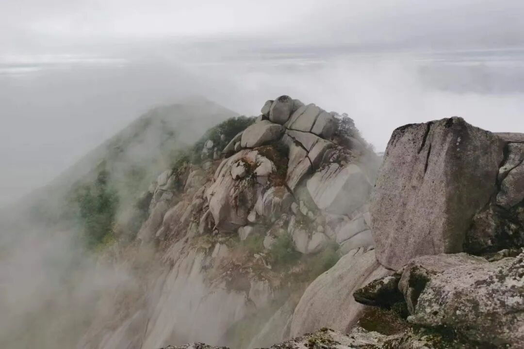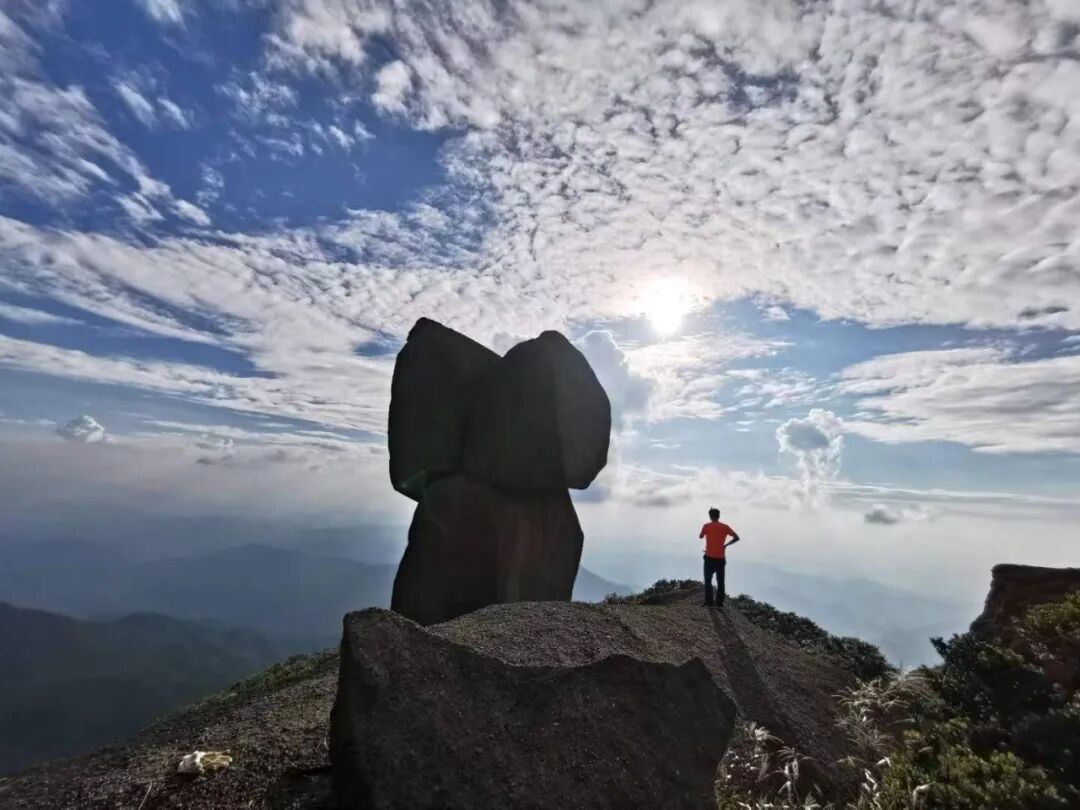光听名字就极具画面感的锅盖顶,远看这里山石像是一个锅盖。山顶由碎裂的花岗岩构成,形成天然的斜坡平台,累了可在此 “躺平” 休息,抬头是湛蓝天空,低头可见云雾在山谷间流转。从石台顶望去,它的轮廓在群山中格外醒目,成为辨别路线的天然地标。