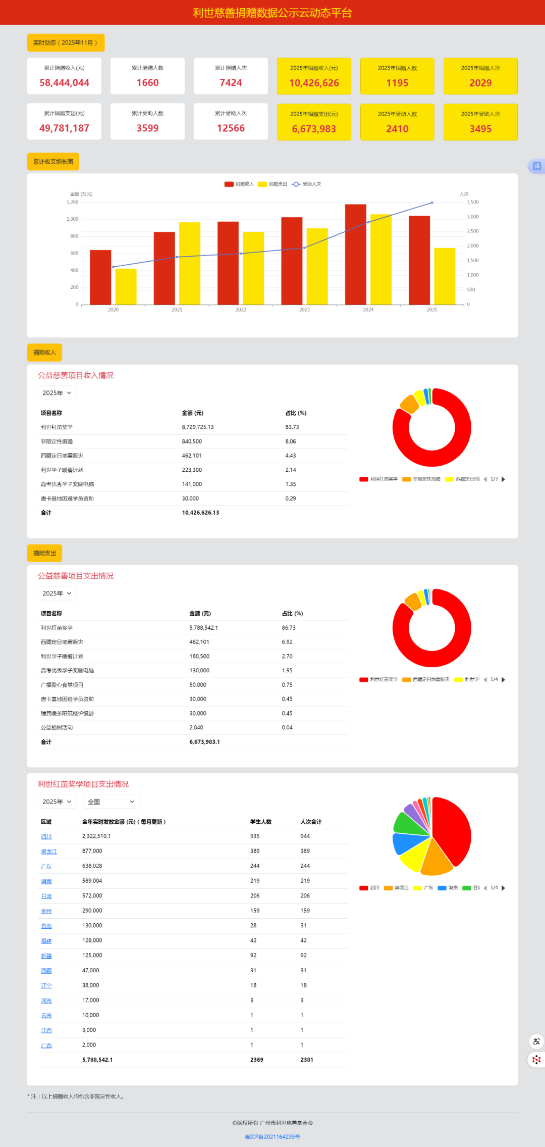 2025年3月,在利世慈善专家委员会数据专家余东老师的专业支持和指导下,从数据统计思路、统计工作流程、后台数据导入、实时动态更新、PC端和移动端的可视化展示等方面进行了全面的沟通和梳理,形成了数据平台框架和研发方向,确定了《捐赠收支流水表》《捐赠金额累计表》《利世红苗奖学项目发放记录表》等一系列表格模板。经过多次反复沟通、上传、调整、修复BUG、校对、审核,2025年11月“利世慈善捐赠数据公示云动态平台”正式上线发布,并进行了计算机软件著作权备案登记。