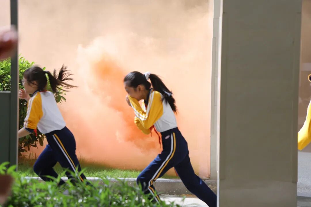 随着应急疏散警声响起,“滚滚浓烟”在宿舍楼梯弥漫,消防应急疏散演练正式开始。各岗位的工作人员沉着冷静地组织同学们疏散逃生。同学们捂住口鼻,弯腰降低重心,按照疏散路线迅速、有序地撤离到操场升旗台前。整个过程中,全体师生态度认真,动作迅速,秩序井然,做到既定时间内快速集合完毕。