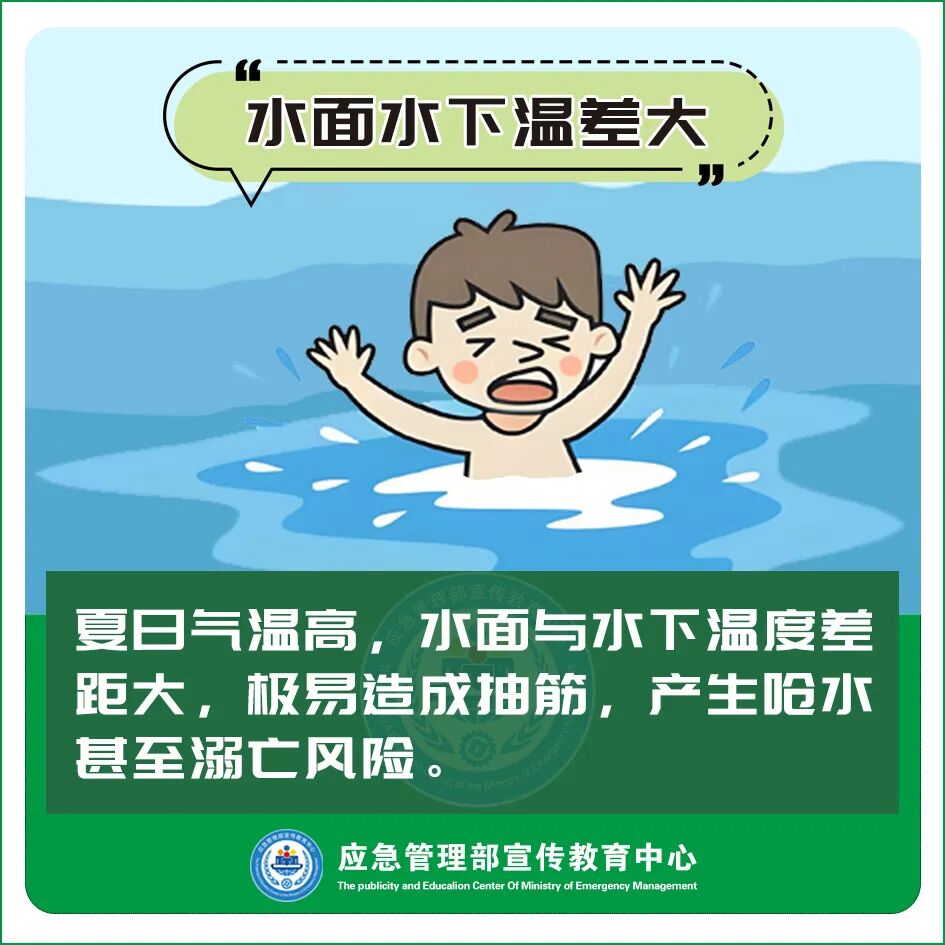 ●水温不定。夏日气温高,水面与水下温度差距大,极易造成抽筋,进而增加呛水甚至溺亡风险。