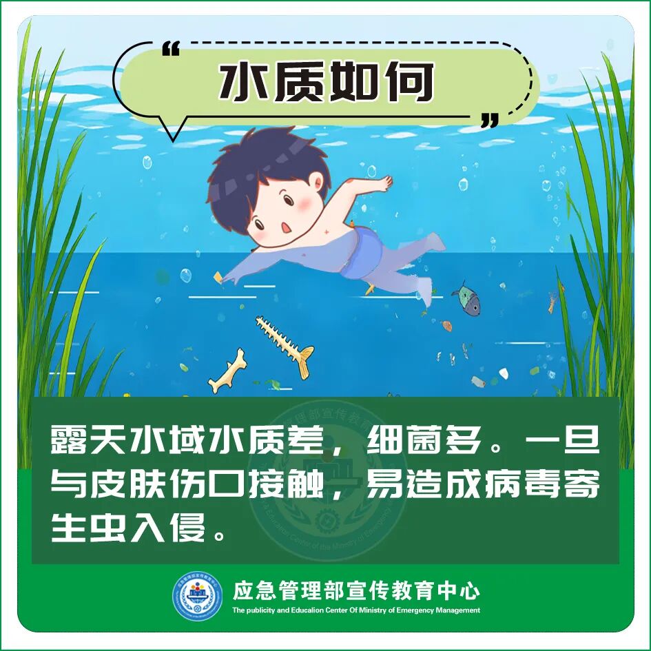 ●水质不稳。野外水域的水未经消毒,水质差,细菌多。一旦与皮肤伤口接触,易造成病毒、寄生虫入侵。