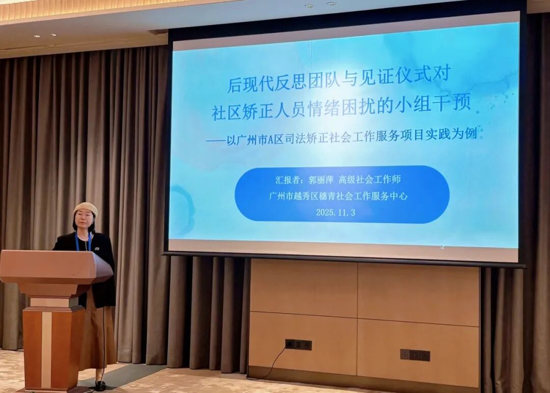广州市越秀区穗青社会工作服务中心荔湾区司法项目督导主任、高级社会工作师郭丽萍受邀在分论坛上就“后现代反思团队与见证仪式在社区矫正情绪干预中的实践应用”进行了专题发言,系统介绍了如何运用叙事治疗、反思团队与见证仪式等后现代干预方法,有效缓解社区矫正人员的情绪困扰,促进其身份重建与社会融入。
