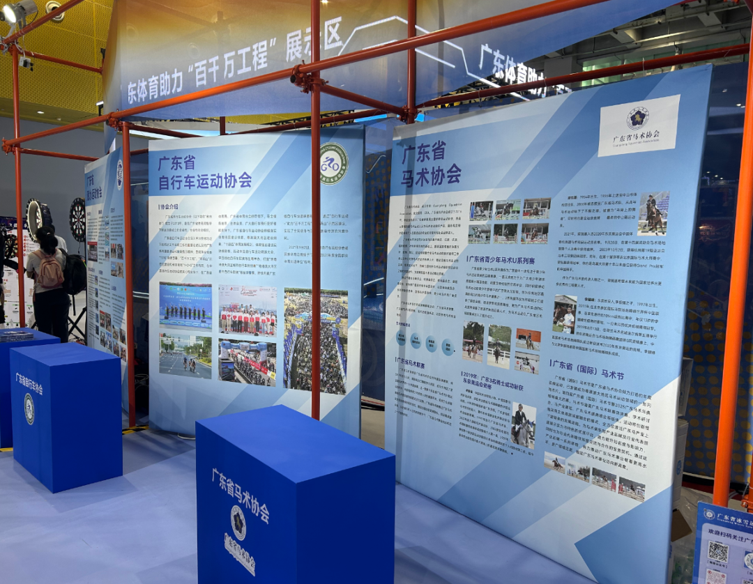 协会风采展区由广东省体育总会牵头,与省篮球、足球、田径、体操技巧、青少年体育联合会及广东省马术协会等联袂亮相,全景绽放“协会力量”。其中,广东省马术协会以“马”为媒惊艳登场。