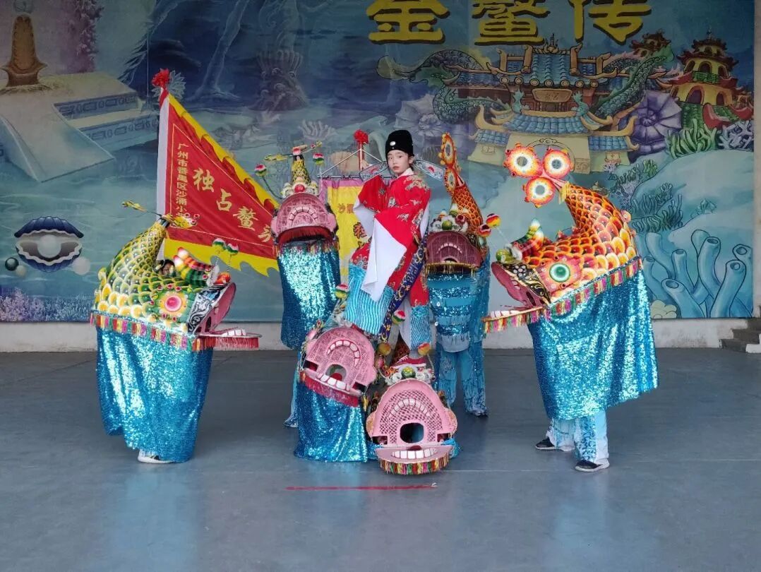 鳌鱼舞是沙涌村的民间传统,已有六百多年的历史。每逢喜庆佳节,番禺沙涌村的村民都要表演鳌鱼舞,渲染节日氛围。鳌鱼少年们左一个高低步,右一个麒麟步,上下跳跃,左右摆动,仿佛化身水中的七彩鲤鱼。