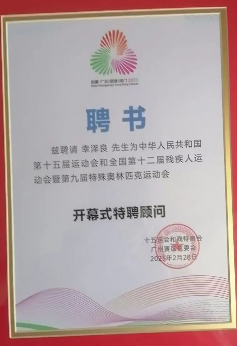 幸泽良(左一)被聘为中华人民共和国第十五届运动会和全国第十二届残疾人运动会暨第九届特殊奥林匹克运动会开幕式特聘顾问