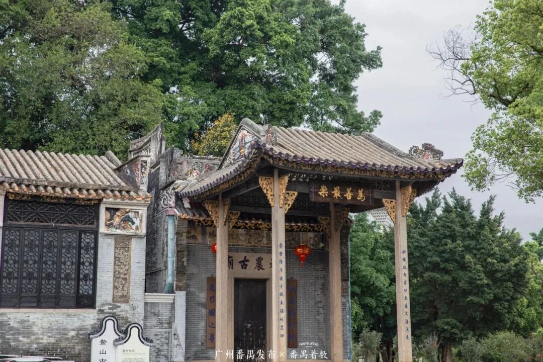 俯瞰番禺的古建筑群,多条生动的鳌鱼跃然其上。始建于明朝的大型古庙群——鳌山古庙宇是典型的岭南风格建筑,建筑严整,外观气派。因山体像鳌,故得名鳌山。