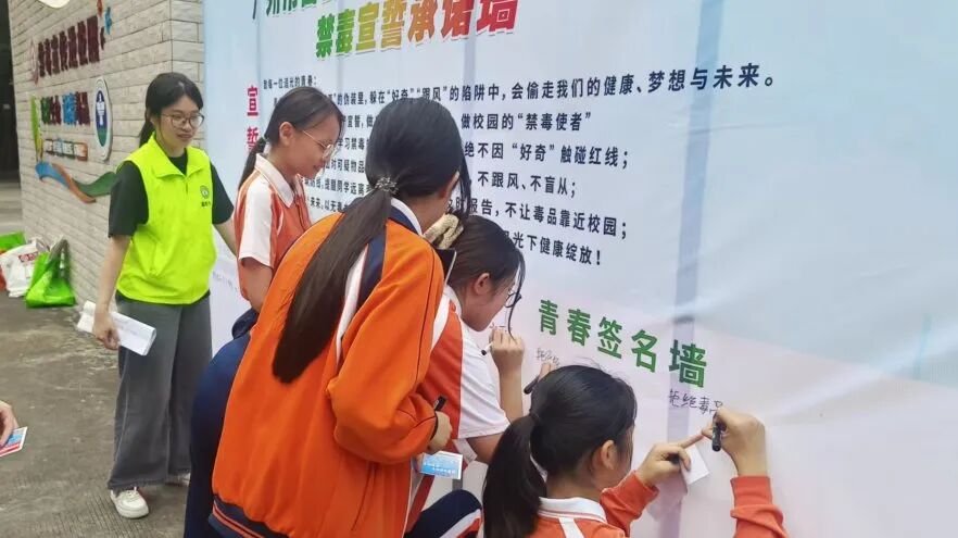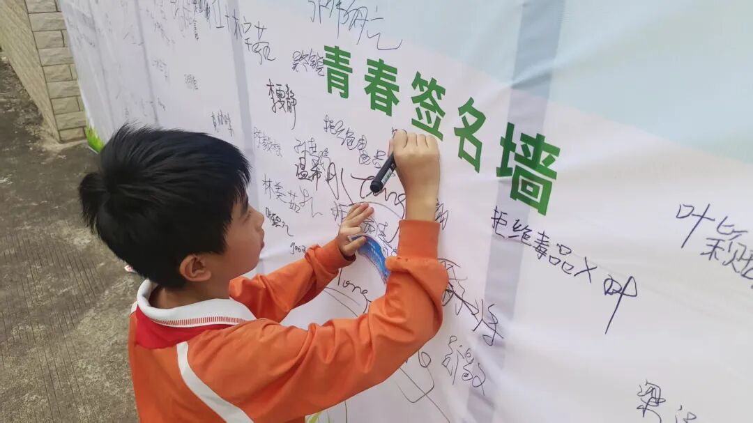 同学们在“禁毒有我同在”签名墙前,认真签下自己的名字,以笔墨定格承诺,用行动表达对禁毒工作的支持。
