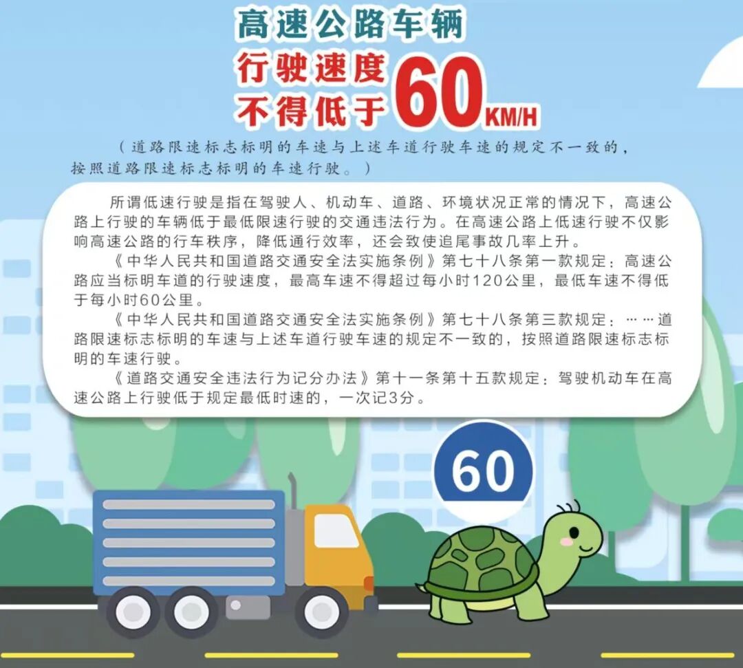 5、严禁低速行驶:高速公路上低速行驶不仅容易引发追尾事故,还会占用有效通行资源,引发交通拥堵。驾车行驶高速公路请严格按照道路限速标志规定的车速行驶。如因车辆故障等原因无法维持正常车速,应尽快驶入应急车道,做好安全警示并拨打高速救援电话12122。