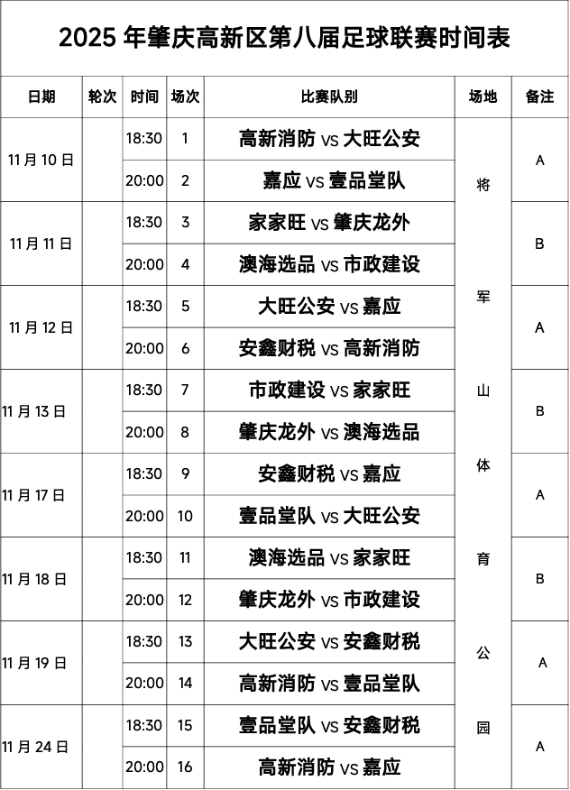 赛事作为高新区全民健身的重要平台,彰显了大湾区青年积极向上的精神风貌。本届联赛将持续至12月,9支队伍将通过激烈角逐争夺荣誉。想为喜爱的球队加油助威?下面这份比赛时间表请收好。