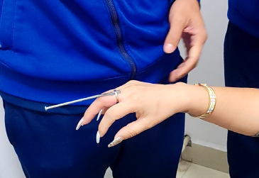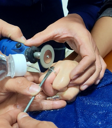 消防救援人员观察发现,由于右中指被铂金戒指卡时间较长,已出现红肿,必须立即摘除戒指。消防救援人员先将手指保护器垫入女士手指与戒指的缝隙,做好防护,接着用电动砂轮手磨机进行拆除。经过约3分钟的处置,卡住女士手指的戒指被成功取下。