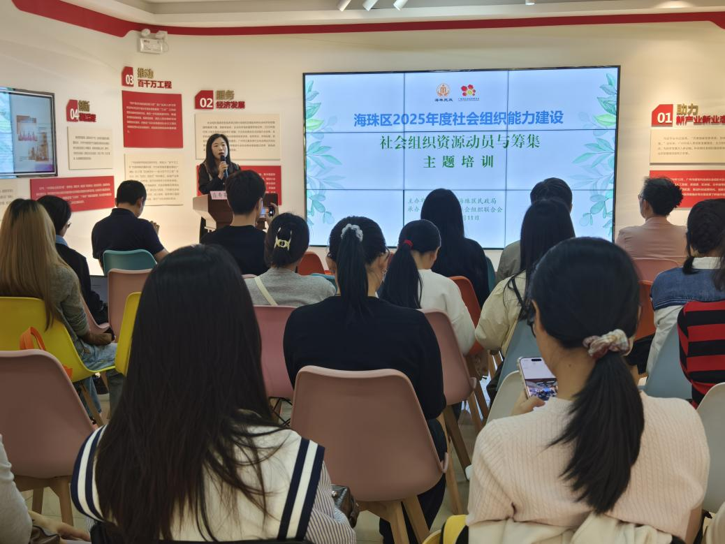 2025年11月11日下午,由广州市海珠区民政局主办、广州市社会组织联合会(以下简称广州社联)承办的海珠区2025年度社会组织能力建设第四期培训暨参访活动在广州市社会组织培育基地顺利举行。本次活动以“社会组织资源动员与筹集”为主题,由广州社联常务副秘书长庄秀英主持,结合实地参访交流,吸引了区内60余家社会组织的负责人及核心工作人员参与。