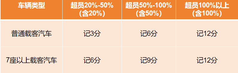 根据《道路交通安全违法行为记分管理办法》规定,车辆超员处罚详细的划分标准: