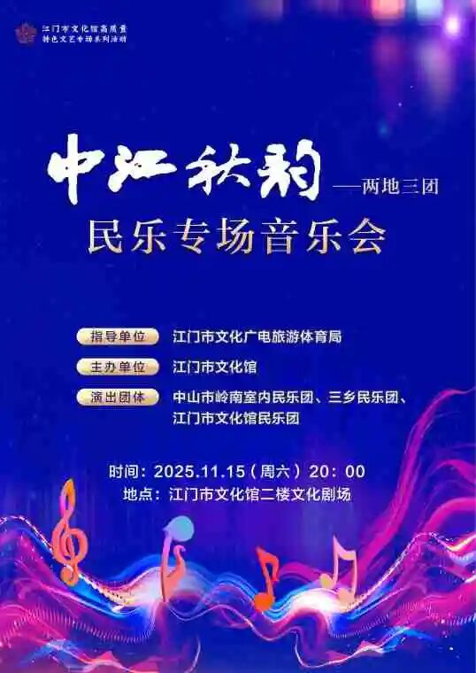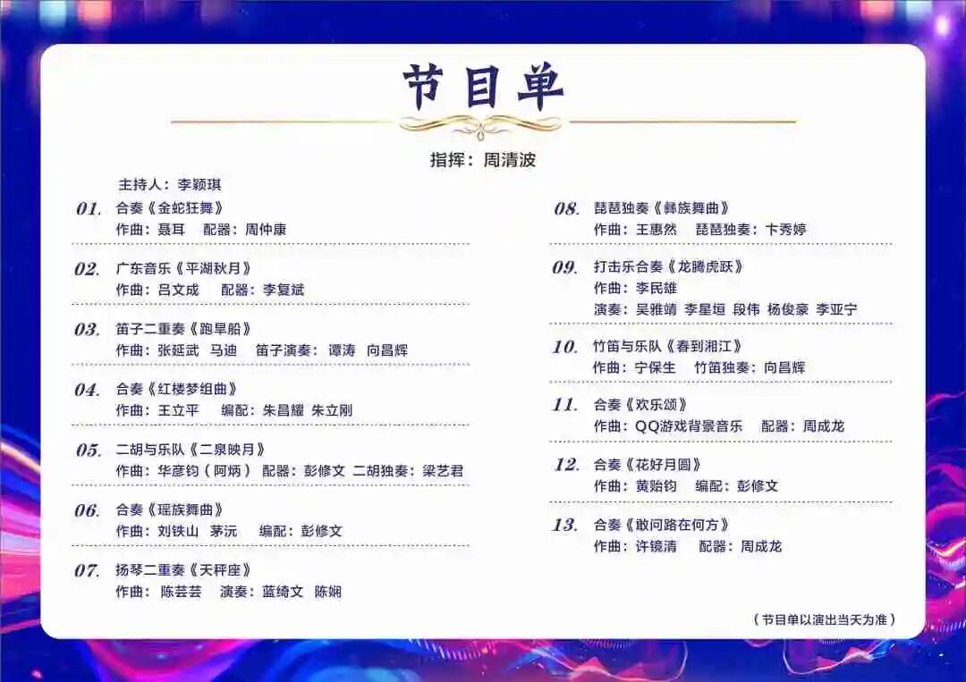 音乐会由中山市岭南室内民乐团、三乡民乐团与江门市文化馆民乐团联袂献艺,更得著名演奏家陈林锋先生鼎力助阵,由周清波先生执棒指挥,梁艺君先生领衔首席;精选《金蛇狂舞》《平湖秋月》《春到湘江》《红楼梦组曲》《二泉映月》《跑旱船》《花好月圆》等经典与现代名篇,以丝竹管弦音韵和鸣,共迎十五运会辉煌盛事,奏响大湾区城市间携手共进的和谐乐章。