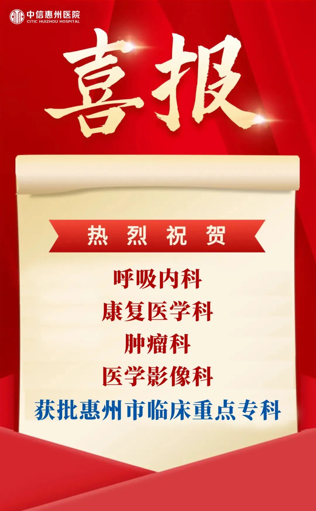 11月10日,惠州市卫生健康局发布了关于公布惠州市市级临床重点专科的通知(惠市卫函【2025】313号),中信惠州医院呼吸内科、康复医学科、肿瘤科、医学影像科成功获批成为惠州市市级临床重点专科。截至目前,中信惠州医院市级临床重点专科数量已增至 7 个,其中涵盖内科3个、外科3个、医技科室1个,标志着医院专科建设进入新阶段、专科水平提升新高度,必将助力医院在高质量转型发展道路上行稳致远,更好服务地区百姓健康。