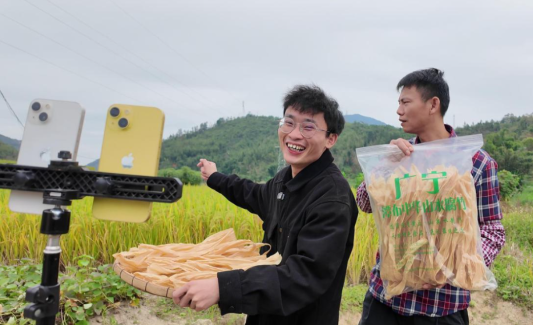 金秋时节的潭布镇,稻田如金色海洋般随风起伏。在这片丰收的背景里,27岁的陈维强正与团队伙伴专注地进行直播。他热情地向观众推介:“家人们请看!这就是我们广宁潭布的中华山水腐竹,豆香浓郁,煮后软糯中带着筋道……”