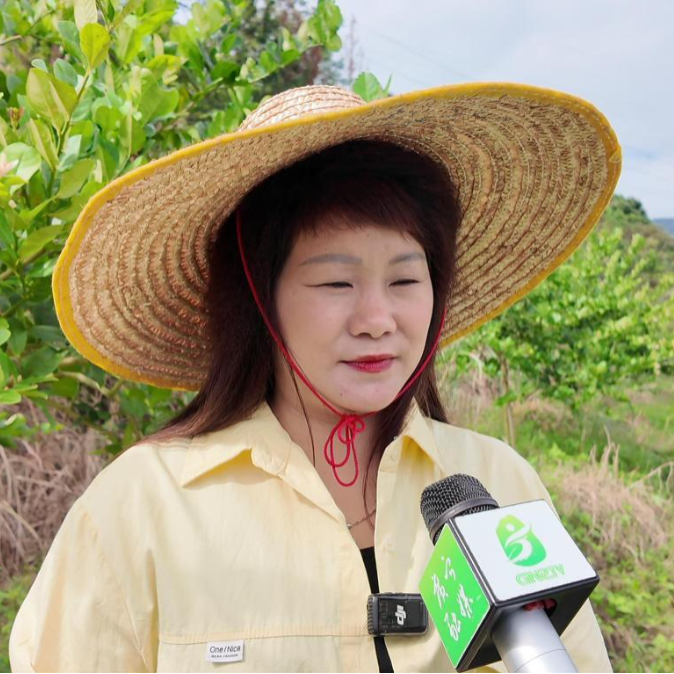 果园中,一位头戴草帽的女士卷起裤脚,手握除草工具,正弯腰在柠檬树下仔细查看着什么。她就是江桂连,广宁县旺民种养专业合作社的创始人,一位从奶茶店转身走向田间地头的新农人。