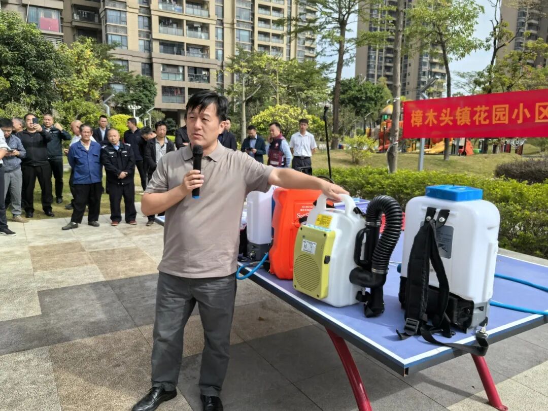 在星岸华庭小区广场,副镇长余捷开以及镇疾控中心、房管所、全镇物业服务企业负责消杀工作人员参加培训。