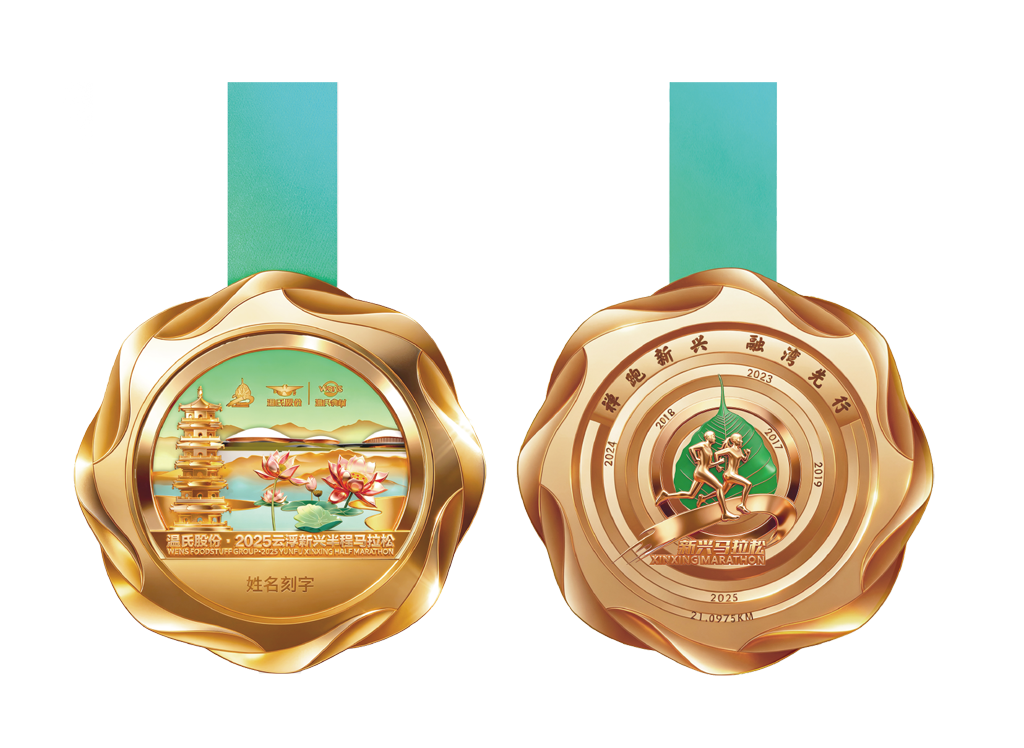 今年奖牌的最大亮点,在于其创新的“可拆卸、多功能”设计。奖牌整体造型圆润饱满,边缘采用花瓣形态,既规整又灵动。正面是一幅可拆卸的冰箱贴,图案融合了新兴体育中心、国恩寺、荷花等本地标志性元素,色彩明快、层次丰富,生动呈现了新兴的自然与人文风貌。