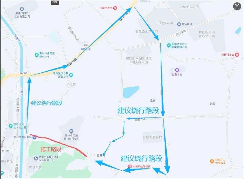 封闭淡水街道YB82乡道(安捷机动车检测站至金星街路段),禁止车辆及行人通行(应急、施工车辆除外)。过往车辆需绕道行驶,推荐绕行路线如示意图所示。