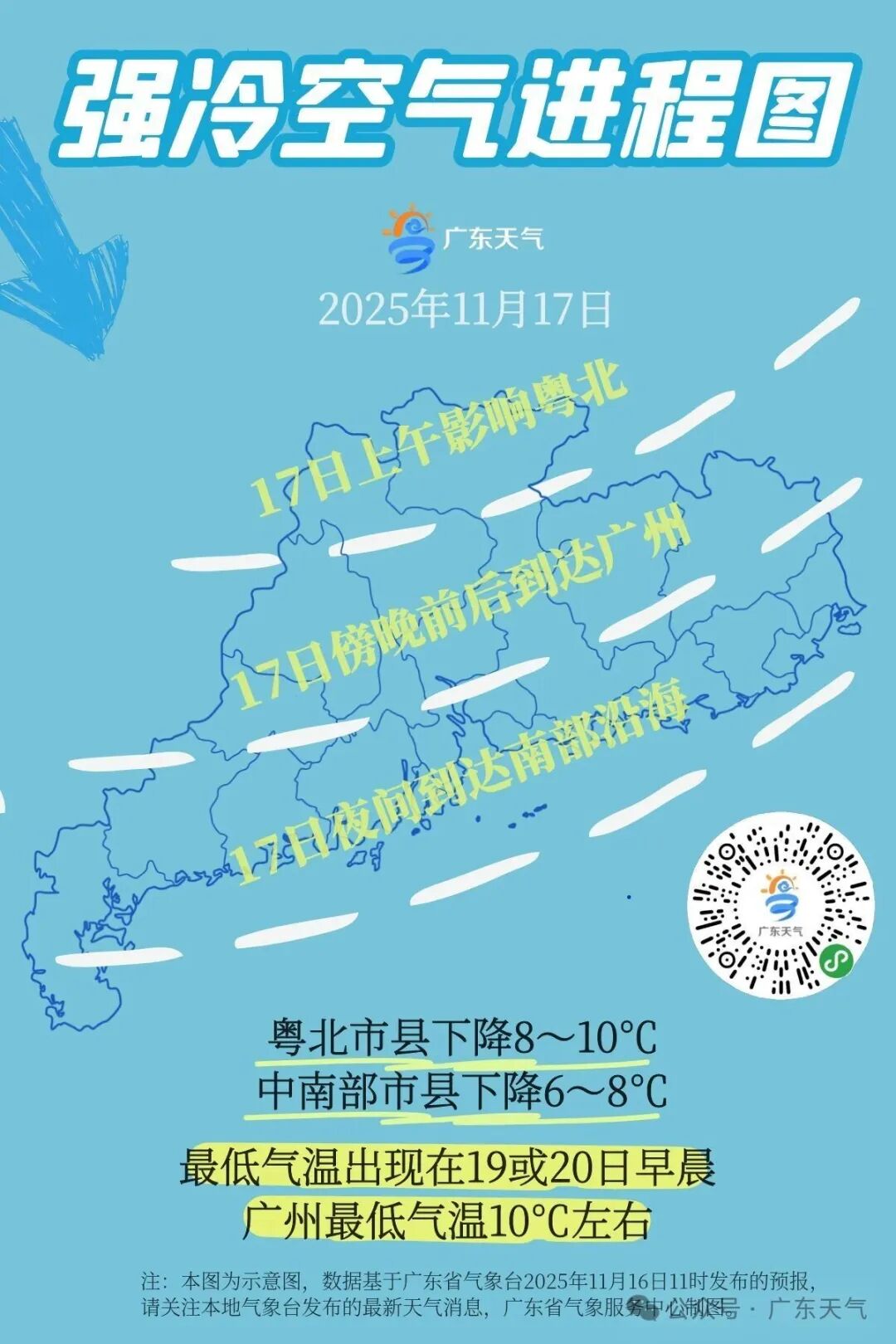 预计11月17日(周一),强冷空气上午影响粤北、傍晚到达广州、夜间到达南部沿海,早出晚归建议备件外套。18-19日,气温进一步下降,过程气温下降幅度:粤北市县下降8~10℃,中南部市县下降6~8℃。另外,冷空气影响期间,部分市县有小雨或零星小雨。请注意及时添衣加被,谨防感冒。