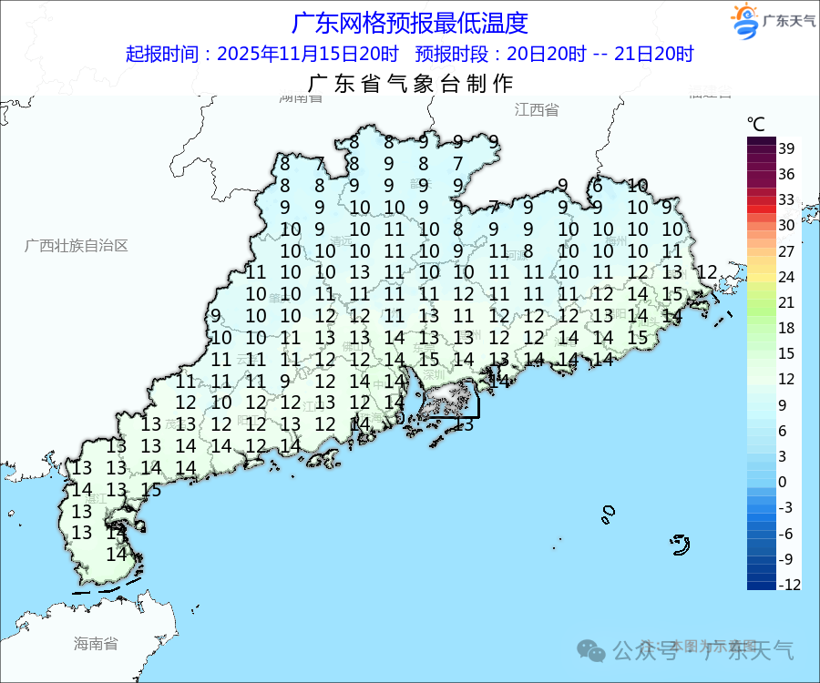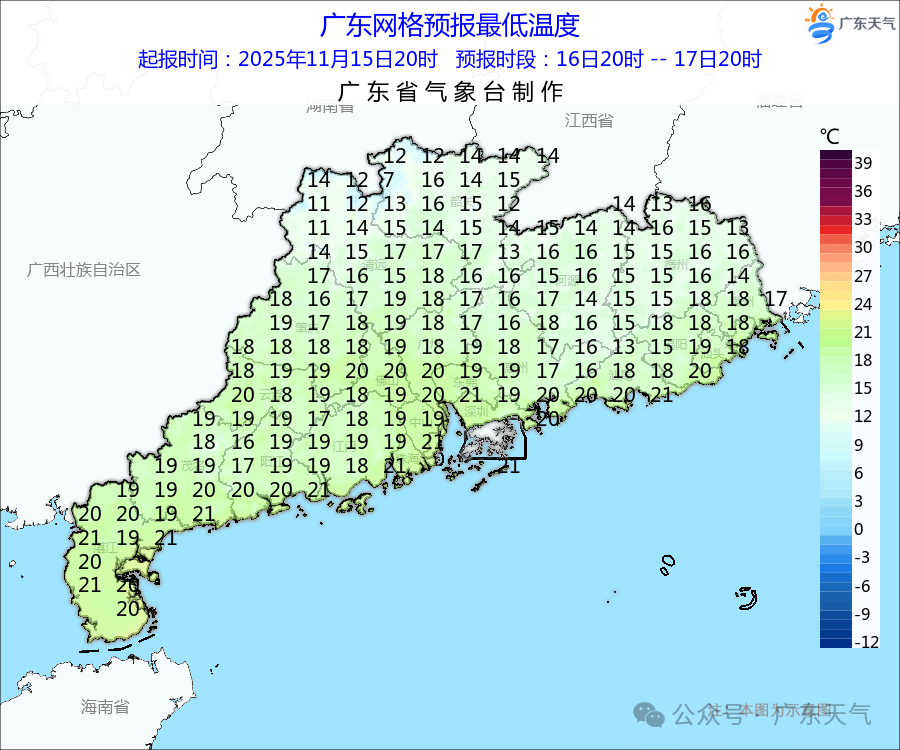 过程最低气温将出现在19日或20日早晨:粤北和珠江三角洲北部市县6~9℃(粤北高海拔山区1~3℃),南部沿海市县13~15℃,其余市县9~12℃,广州最低气温10℃左右。