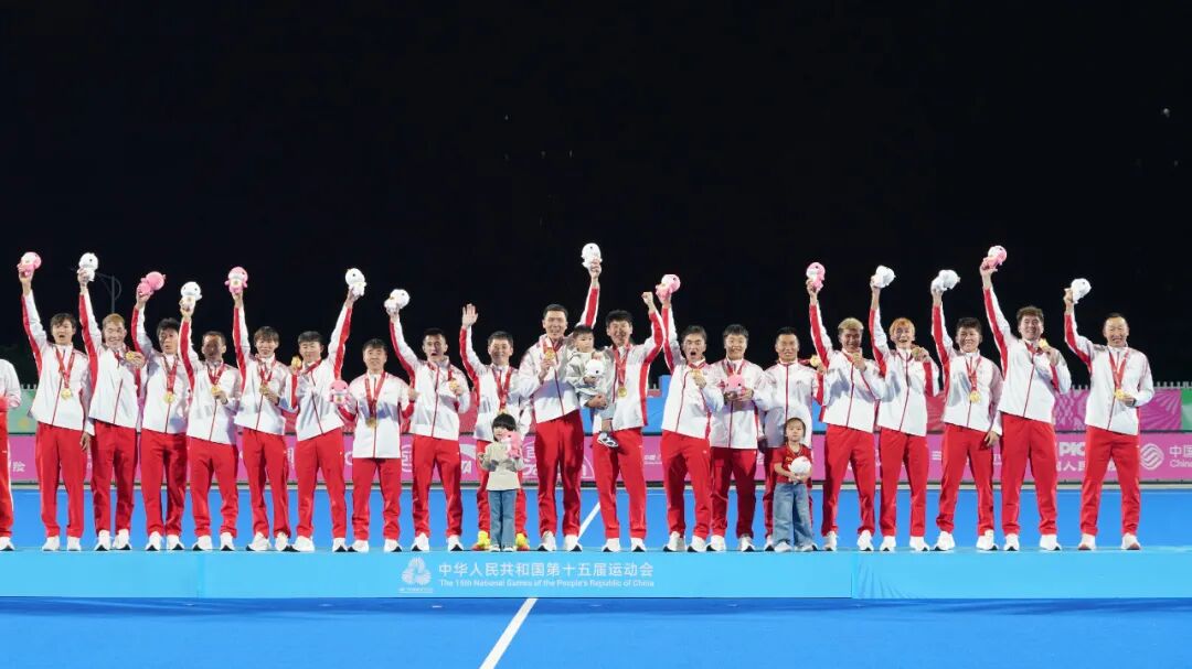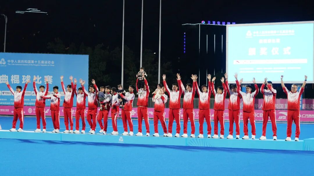 比赛结束后,第十五届全国运动会曲棍球项目男子组比赛颁奖仪式在广东省云浮市曲棍球场举行,辽宁队、广东队及内蒙古队全体队员依次接过了铜牌、银牌和金牌,全场观众热烈祝贺。