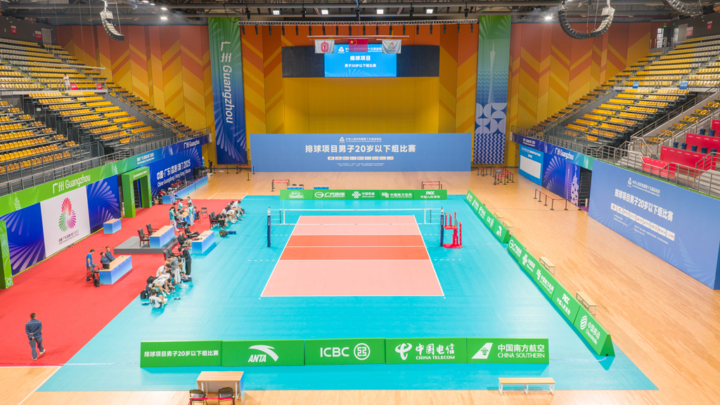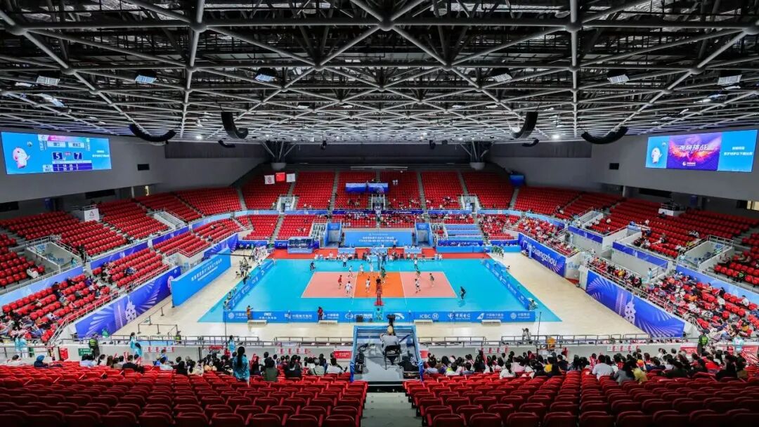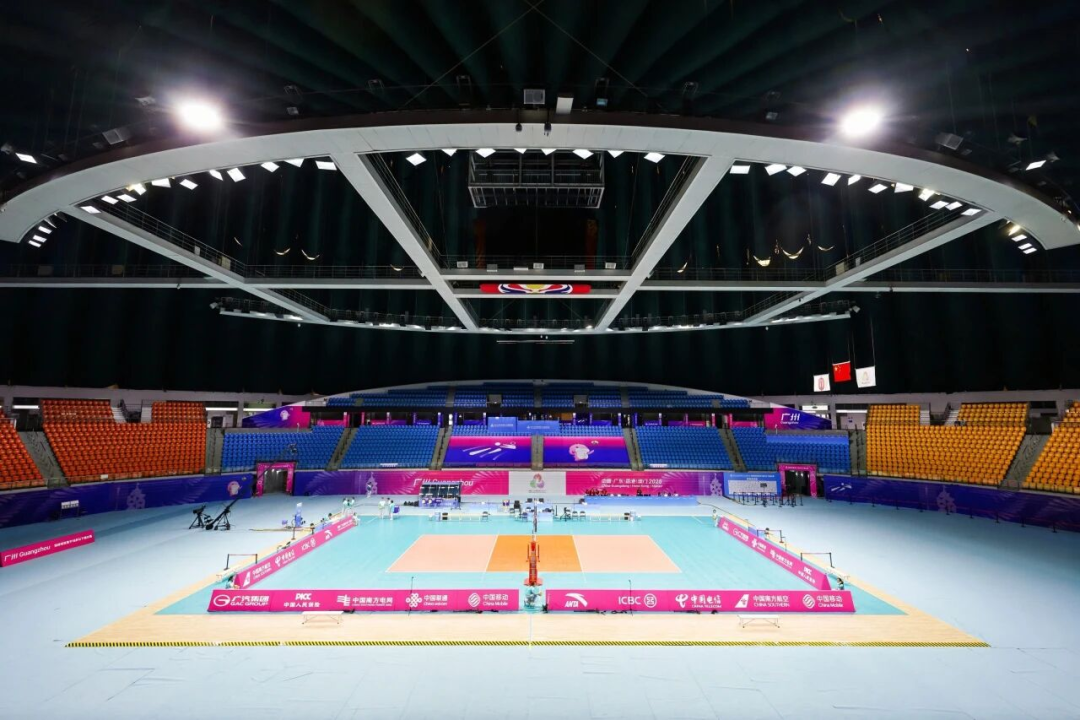 天河体育中心体育馆是有38年历史的老场馆,历经六运会、九运会、亚运会和亚残运会,如今以“广州红”座椅、专业灯光系统及智慧化改造,焕发新活力,成为U18男排决赛场地。