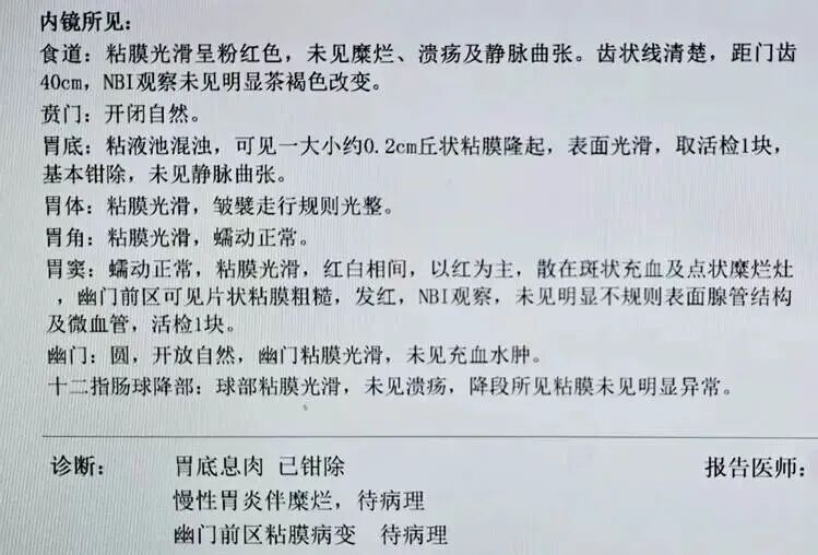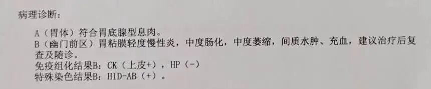 辅助检查:胃镜示“胃底息肉、慢性胃炎伴糜烂、幽门前区粘膜病变”;病理诊断示“(胃体)胃底腺型息肉,(幽门前区)胃粘膜轻度慢性炎,中度肠化,中度萎缩,间质水肿充血”,免疫组化HP(-),特殊染色HID-AB(+)。