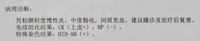 辅助检查:胃镜示“慢性非萎缩性胃炎伴糜烂出血”;病理诊断示“胃粘膜轻度慢性炎,中度肠化,间质充血”,免疫组化HP(-),特殊染色HID-AB(+)。