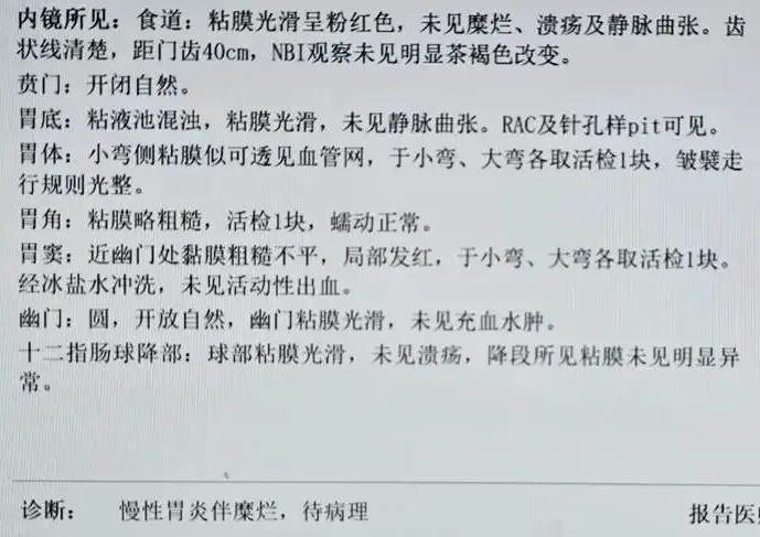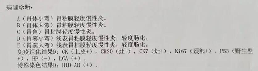 辅助检查:胃镜示“慢性胃炎伴糜烂”;病理诊断示“(胃体小弯、大弯,胃角)胃粘膜轻度慢性炎,(胃窦小弯、大弯)浅表胃粘膜轻度慢性炎,轻度肠化”,免疫组化Ki67(颈部+)、P53(野生型+),HP(-)。