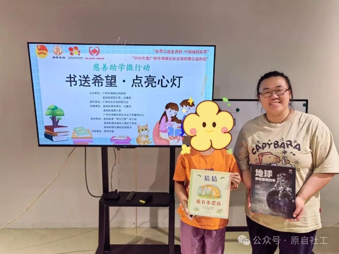 为帮助龙凤街辖内经济困难家庭儿童获得助学支持,丰富他们的课外阅读资源,近日,在“彩票公益金资助-中国福利彩票”及“2025年度广州市海珠区社会组织微公益创投”项目的大力支持下,广州市海珠区原自社会工作服务中心联合龙凤街道党建办、公服办、团工委、未成年人保护工作站、马涌社区居委会、厚朴学堂等多个合作单位,共同发起“书送希望·点亮心灯”慈善助学微行动。本次活动共为50名困境儿童和流动儿童提供助学阅读包。