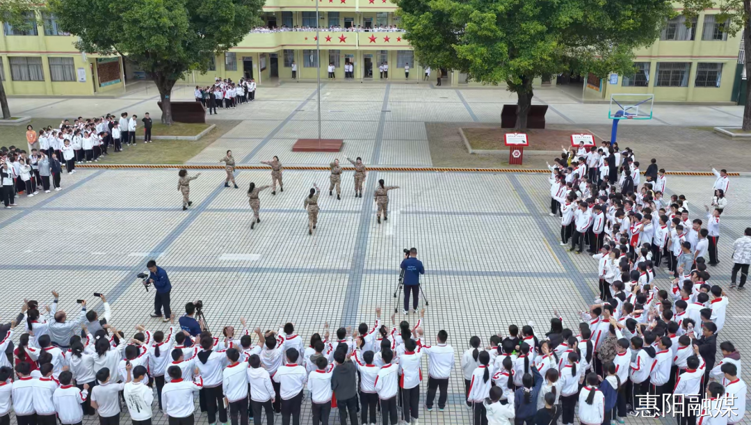 课间时分,一场以《烈火永生》为主题的快闪活动在学校广场上演。课间音乐刚停,嘹亮冲锋号骤响,8名纪念馆讲解员迅速跑向操场中心集结。伴随着激昂旋律,她们饱含热情完成表演。歌曲高潮部分,印有“叶挺独立团建团100周年”的巨型横幅及“弘扬铁军精神”“青春奋进正当时”等主题竖幅从教学楼高处同时展开,将现场气氛推向顶点。