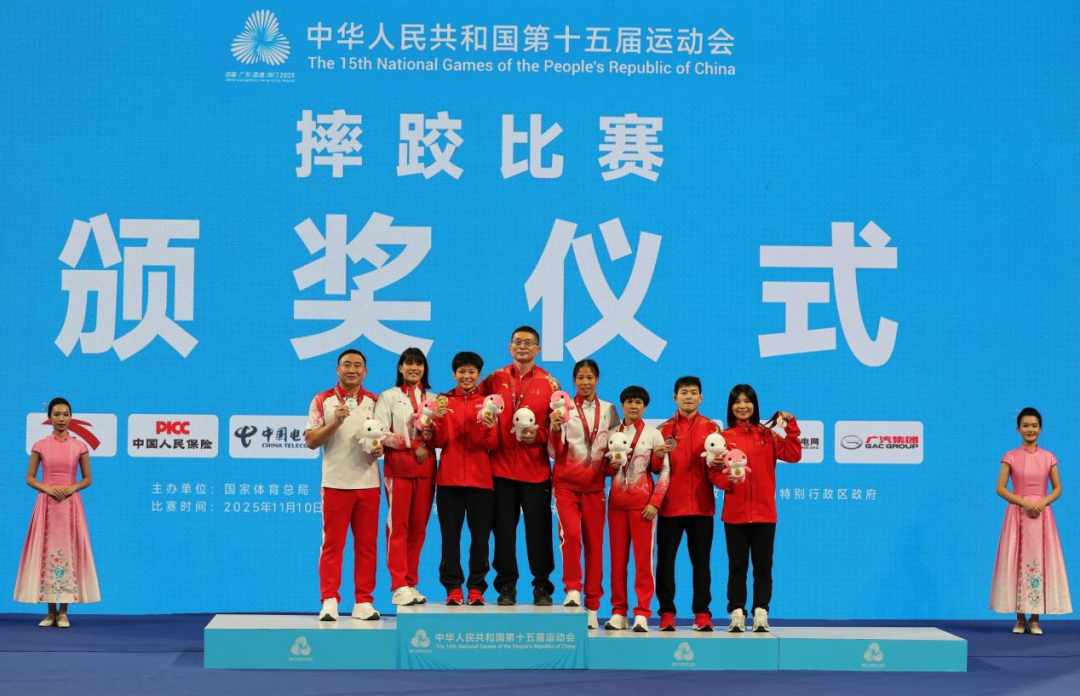 11月19日,冠军江苏队(中)、亚军广东队(左)、季军山东队在颁奖仪式上合影。左二郭怡琪。