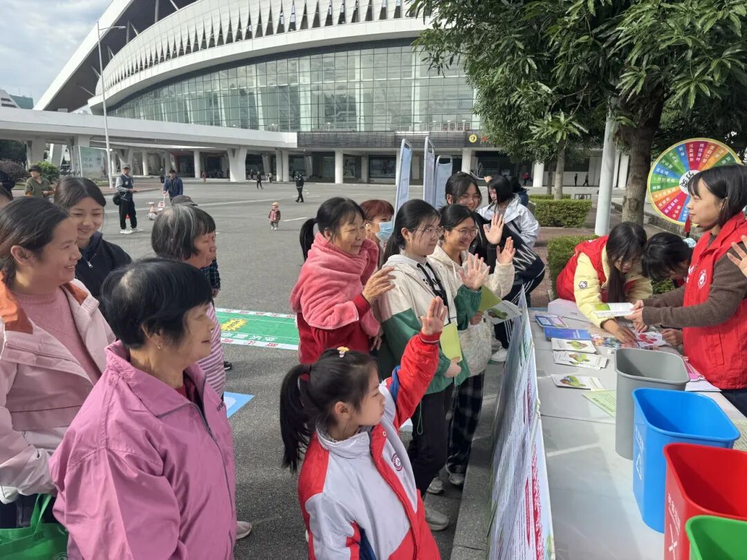 活动现场,宣传摊位整齐排布,低碳生活、垃圾分类等主题展板依次陈列,志愿者们身着志愿服装,带着饱满热情主动上前,向过往市民细致讲解低碳出行、节约水电、垃圾分类实操规范等内容。