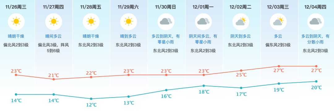 11月30日—12月1日受高空波动影响,多云到阴天,偶有零星小雨;